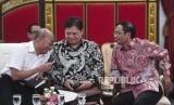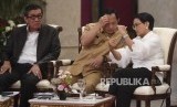 Menko PMK Muhadjir Effendy (kiri) berbincang dengan Menko Perekonomian Airlangga Hartarto (tengah) dan Menko Polhukam Mahfud MD sebelum Sidang Kabinet Paripurna di Istana Negara, Jakarta, Senin (6/1/2020). (FOTO : WAHYU PUTRO A/ANTARA FOTO)