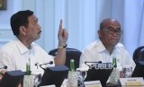 Menko Maritim dan Investasi Luhut Binsar Panjaitan (kiri) dan Menko PMK Muhadjir Effendy mengikuti rapat kabinet terbatas di Kantor Presiden, Jakarta, Senin (6/1/2020). (FOTO : WAHYU PUTRO A/ANTARA FOTO)