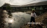 Siswa Madrasah Ibtidaiyah Mansyaul Huda berjalan di kawasan sekolah yang terkena abrasi di Kampung Beting, Pantai Bahagia, Muara Gembong, Kabupaten Bekasi, Jawa Barat. (FOTO : Thoudy Badai)