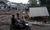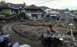 Pengendara motor melintasi area yang terdampak longsor di Desa Harkatjaya, Sukajaya, Bogor, Jawa Barat, Senin (6/1). (FOTO : Republika/Putra M. Akbar)