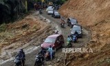 Sejumlah kendaraan melintasi jalanan yang telah dibuka akibat longsor di Desa Harkatjaya, Sukajaya, Bogor, Jawa Barat, Senin (6/1). (FOTO : Republika/Putra M. Akbar)