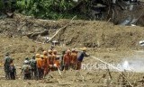 Sejumlah petugas gabungan menyemprotkan air ke lumpur saat melakukan proses evakuasi korban longsor di Kampung Sinar Harapan, Desa Harkatjaya, Sukajaya, Bogor, Jawa Barat, Selasa (7/1). (FOTO : Republika/Putra M. Akbar)