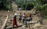 Sejumlah petugas gabungan saat melakukan proses evakuasi korban longsor di Kampung Sinar Harapan, Desa Harkatjaya, Sukajaya, Bogor, Jawa Barat, Selasa (7/1). (FOTO : Republika/Putra M. Akbar)