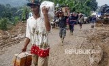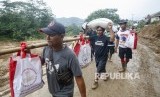 REPUBLIKA.CO.ID, BOGOR -- Distribusi sembako dan pakaian bagi pengungsi di Harkat Jaya, Sukajaya, Bogor, Jawa Barat, dilakukan relawan hingga malam hari. Bantuan tersebut dibawa dengan berjalan kaki ke daerah yang masih terisolasi dan belum bisa dilewati oleh kendaraan roda dua dan empat.