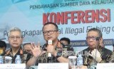 Menteri Kelautan dan Perikanan Edhy Prabowo (tengah) didampingi Gubernur Kalimantan Barat Sutarmidji (kanan) dan Plt Direktur Jenderal Pengawasan Sumber Daya Kelautan dan Perikanan (PSDKP) Nilanto Perbowo (kiri) memaparkan kronologis penangkapan kapal pencuri ikan berbendera Vietnam saat jumpa pers di Stasiun Pengawasan Sumber Daya Kelautan dan Perikanan (PSDKP) Pontianak di Sungai Rengas, Kabupaten Kubu Raya, Kalimantan Barat, Kamis (9/1/2020). (FOTO : Antara/Jessica Helena Wuysang)