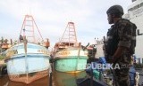 Seorang petugas Kapal Pengawas Kementerian Kelautan dan Perikanan bersiaga di sekitar kapal pencuri ikan berbendera Vietnam hasil tangkapan di Stasiun Pengawasan Sumber Daya Kelautan dan Perikanan (PSDKP) Pontianak di Sungai Rengas, Kabupaten Kubu Raya, Kalimantan Barat, Kamis (9/1/2020). (FOTO : Antara/Jessica Helena Wuysang)