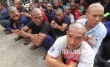 Sejumlah nelayan kapal pencuri ikan berbendera Vietnam berbaris saat dihadirkan dalam rilis ungkap kasus di di Stasiun Pengawasan Sumber Daya Kelautan dan Perikanan (PSDKP) Pontianak di Sungai Rengas, Kabupaten Kubu Raya, Kalimantan Barat, Kamis (9/1/2020). (FOTO : Antara/Jessica Helena Wuysang)