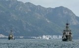 KRI Sutedi Senoputra-378 (kiri) dan KRI Teuku Umar-385 (kanan) berlayar meninggalkan Faslabuh Lanal Ranai, Selat Lampa, Natuna, Kepulauan Riau, Kamis (9/1/2020). (FOTO : Antara/M Risyal Hidayat)