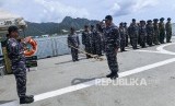 Prajurit KRI Usman Harun-359 melakukan peran parade lambung kanan saat meninggalkan Faslabuh Lanal Ranai, Selat Lampa, Natuna, Kepulauan Riau, Kamis (9/1/2020). (FOTO : Antara/M Risyal Hidayat)