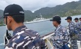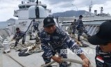 Prajurit KRI Usman Harun-359 menarik tros saat akan meninggalkan Faslabuh Lanal Ranai, Selat Lampa, Natuna, Kepulauan Riau, Kamis (9/1/2020). (FOTO : Antara/M Risyal Hidayat)