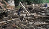Warga mengangkat batang pohon yang menumpuk akibat banjir bandang di Kampung Parung Sapi, Desa Kalong Sawah, Kecamatan Jasinga, Kabupaten Bogor, Jawa Barat, Kamis (9/1/2020). (FOTO : Antara/Arif Firmansyah)