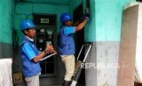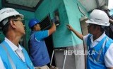 Direktur Bisnis Regional Jawa, Madura, Bali, Haryanto WS (kanan) bersama General Manager PLN UID Jakarta Raya, M. Ikhsan Asaad (kiri) meninjau pemasangan instalasi listrik baru di rumah warga yang menjadi korban banjir di Perumahan Pondok Gede Permai, Bekasi, Jumat (10/1). (FOTO : Yogi Ardhi/Republika)