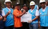 Direktur Bisnis Regional Jawa, Madura, Bali, Haryanto WS (kedua kanan) bersama General Manager PLN UID Jakarta Raya, M. Ikhsan Asaad (kanan) didampingi EVP Operasi Regional Jawa Bagian Barat PLN menyerahkan mockup bantuan sembako kepada warga Perumahan Pondok Gede Permai, Bekasi, Jumat (10/1). (FOTO : Yogi Ardhi/Republika)