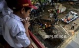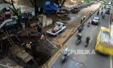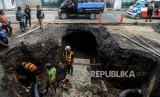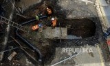 Petugas saat memperbaiki pipa PDAM pada jalan yang amblas di Jalan Daan Mogot, Tangerang, Banten, Senin (13/1). (FOTO : Republika/Putra M. Akbar)