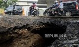 Pengendara motor melihat kondisi jalan yang amblas di Jalan Daan Mogot, Tangerang, Banten, Senin (13/1). (FOTO : Republika/Putra M. Akbar)