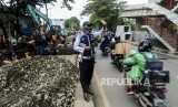 Petugas saat melakukan pengalihan arus lalu lintas di dekat jalan yang amblas di Jalan Daan Mogot, Tangerang, Banten, Senin (13/1). (FOTO : Republika/Putra M. Akbar)