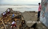 Warga melihat kondisi bangunan rumah yang roboh akibat terkena abrasi pantai di Desa Sampulungan, Kecamatan Galesong Utara, Kabupaten Takalar, Sulawesi Selatan, Senin (13/1/2020). (FOTO : ABRIAWAN ABHE/ANTARA FOTO)