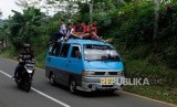 Sejumlah pelajar menumpang di atas atap mobil angkutan pedesaan saat melintas di jalan raya Sukorejo-Pekalongan Desa Bawang, Batang, Jawa Tengah, Senin (13/1/2020). (FOTO : ANIS EFIZUDIN/ANTARA FOTO)