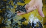 Warga memperlihatkan tukik penyu belimbing sebelum dilepasliarkan ke habitatnya di Pantai Lhoknga, Aceh Besar, Aceh, Senin (13/1/2020). (FOTO : Antara/Irwansyah Putra)