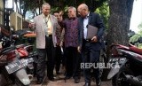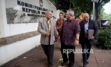 Ketua KPU Arief Budiman (tengah) berjalan bersama Ketua Tim Hukum PDIP I Wayan Sudirta (kanan) dan Koordinator Tim Pengacara PDIP Teguh Samudera (kiri) sebelum melakukan audiensi di Kantor KPU, Jakarta, Kamis (16/1). (FOTO : Republika/Prayogi)