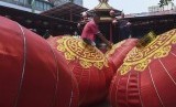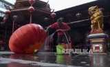 Seorang pekerja mencuci lampion di Vihara Dharma Bhakti, Petak Sembilan, Jakarta, Kamis (16/1/2020). (FOTO : WAHYU PUTRO A/ANTARA FOTO)