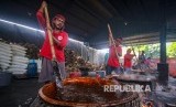 Pekerja menyelesaikan proses pembuatan dodol di Ny. Lauw, Neglasari, Kota Tangerang, Banten, Kamis (16/1/2020). Jelang tahun baru Imlek permintaan dodol di tempat tersebut naik empat kali lipat dibandingkan hari biasa. (FOTO : Fauzan/Antara)