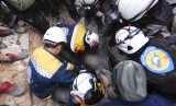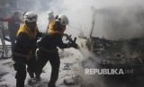 TIm SAR mengevakuasi jenazah dari gedung yang hancur akibat serangan udara pasukan pemerintah di Kota Ariha, Provinsi Idlib Suriah, Rabu (15/1). (FOTO : Ghaith Alsyayad/AP)