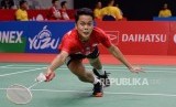 REPUBLIKA.CO.ID, JAKARTA--Anthony Sinisuka Ginting memenangi duel sesama tunggal putra Indonesia melawan Tommy Sugiarto dengan skor 21-16, 21-15. Kemenangan ini membuat Ginting lolos ke perempat final Daihatsu Indonesia Masters 2020.