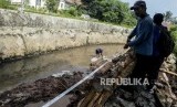 Sejumlah Petugas Dinas Sumber Daya Air (SDA) Jakarta Selatan saat mengukur tanggul yang jebol di Kompleks TVRI Kemandoran, Kebayoran Lama, Jakarta, Ahad (19/1). (FOTO : Republika/Putra M. Akbar)