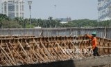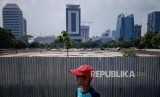 warga melintas dikawasan proyek revitalisasi Taman Monumen Nasional, Jakarta, Ahad (19/1). (FOTO : Thoudy Badai_Republika)