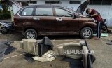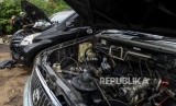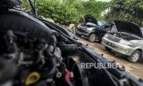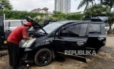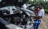 Seorang warga memperbaiki mobilnya yang mogok di Kompleks TVRI Kemandoran, Kebayoran Lama, Jakarta, Ahad (19/1). (FOTO : Republika/Putra M. Akbar)