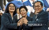 Rektor Institut Teknologi Bandung (ITB) Periode 2020-2025 Reini D Wirahadikusumah (kiri) berjabat tangan dengan Ketua Majelis Wali Amanat ITB Yani Paniogoro (tengah) dan Rektor Institut Teknologi Bandung (ITB) Periode 2015-2020 Kadarsah Suryadi usai dilantik saat Sidang Terbuka Pelantikan Rektor Baru Institut Teknologi Bandung (ITB) Periode 2020-2025 di Aula Barat ITB, Jalan Ganesha, Kota Bandung, Senin (20/1). (FOTO : Abdan Syakura)