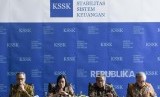Menteri Keuangan Sri Mulyani Indrawati (kedua kiri) didampingi Gubernur Bank Indonesia (BI) Perry Warjiyo (kedua kanan), Ketua Dewan Komisioner Otoritas Jasa Keuangan (OJK) Wimboh Santoso (kiri) dan Ketua Dewan Komisioner Lembaga Penjamin Simpanan (LPS) Halim Alamsyah (kanan) menyampaikan keterangan pers seusai menggelar rapat Komite Stabilitas Sistem Keuangan (KSSK) di Kementerian Keuangan, Jakarta, Rabu (22/1/2020). (FOTO : Antara/Hafidz Mubarak A)