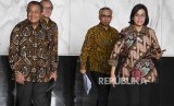 Menteri Keuangan Sri Mulyani Indrawati (kanan) bersama Gubernur Bank Indonesia (BI) Perry Warjiyo (kiri), Ketua Dewan Komisioner Otoritas Jasa Keuangan (OJK) Wimboh Santoso (kedua kanan) dan Ketua Dewan Komisioner Lembaga Penjamin Simpanan (LPS) Halim Alamsyah (kedua kiri) seusai menggelar rapat Komite Stabilitas Sistem Keuangan (KSSK) di Kementerian Keuangan, Jakarta, Rabu (22/1/2020). (FOTO : Hafidz Mubarak A/ANTARA FOTO)