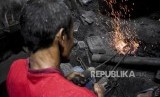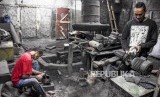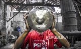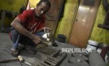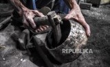 Pekerja menyelesaikan pembuatan bonang sebagai salah satu instrumen perangkat gamelan di Industri Rumahan Gamelan Bah Omo, Jalan Kolonel Masturi, Kota Cimahi, Rabu (22/1). (FOTO : Abdan Syakura_Republika)
