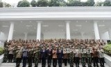 Presiden Joko Widodo bersama Menteri Pertahanan Prabowo Subianto, Menkopolhukam Mahfud MD, Menteri Luar Negeri Retno Marsudi, Kepala Staf Kepresidenan Moeldoko, Panglima TNI Marsekal Hadi Tjahjanto dan Kapolri Jenderal (Pol) Idham Azis saat sesi foto bersama usai rapat pimpinan Kementerian Pertahanan di Jakarta, Kamis (23/1). (FOTO : Republika/Putra M. Akbar)