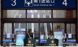 Aparat petugas China mengenakan masker berjaga di pintu masuk Stasiun Kereta Hankou Railway, Setelah seluruh Kota Wuhan disolasi untuk menghindari penyeberan virus nCoV. (FOTO : China Daily via Reuters)