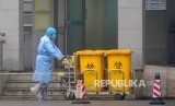 Petugas membawa limbah biologis berbahaya melintasi Wuhan Medical Treatment Center, dimana pasien yang terjangkit virus strain baru dirawat di Kota Wuhan, China, Rabu , (23/1). (FOTO : Dave Kang/AP)
