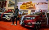 Seorang nasabah Bank Sulteng berdiri di antara dua kendaraan hadiah utama undian Semarak Simpeda dan Tabungan PNS Bank Sulteng di Palu, Sulawesi Tengah, Sabtu (25/1/2020). (FOTO : BASRI MARZUKI/ANTARA FOTO)