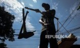 Sodikin (30) menunggu pelanggan di trotoar Jalan Punak, CInere, Depok, Jawa Barat, Senin (27/1). (FOTO : Republika/Thoudy Badai)