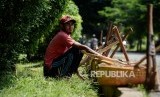 Wiryo (50) menunggu pelanggan di trotoar Jalan Punak, CInere, Depok, Jawa Barat, Senin (27/1). (FOTO : Republika/Thoudy Badai)