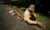 Suherman (57) menunggu pelanggan di trotoar Jalan Punak, CInere, Depok, Jawa Barat, Senin (27/1). (FOTO : Republika/Thoudy Badai)
