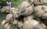 Buruh tani mengangkut bengkuang saat panen di area persawahan Desa Tugurejo, Kota Kediri, Jawa Timur, Senin (27/1/2020) (FOTO : Antara/Prasetia Fauzani)