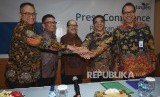 Direktur Utama PT Taspen (Persero) Antonius N.S Kosasih (tengah), Komisaris Utama Franky Sibarani (kedua kanan), Direktur SDM, Teknologi Informasi dan Kepatuhan Feb Sumandar (kiri), Direktur Keuangan Patar Sitanggang (kedua kiri), dan Direktur Operasional Mohamad Jufri, bertumpu tangan bersama saat Paparan Kinerja PT Taspen (Persero), di Jakarta, Senin (27/1/2020). (FOTO : Antara/Indrianto Eko Suwarso)