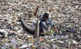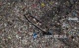 Seorang warga menggunakan perahu untuk memilah sampah plastik di tumpukan sampah yang memenuhi sungai Citepus yang bermuara ke Sungai Citarum di Kampung Bojong Citepus, Kecamatan Dayeuhkolot, Kabupaten Bandung, Selasa (28/1). (FOTO : Abdan Syakura_Republika)