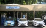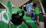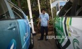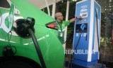 Pengemudi taxi melakukan pengisian daya pada mobil listrik di Stasiun Pengisian Kendaraan Listrik Umum (SPKLU) PLN di Kantor PLN Disjaya, Gambir, Jakarta, Selasa (28/1). (FOTO : Republika/Prayogi)