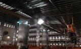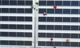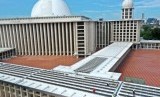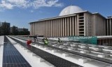 Sejumlah pekerja memasang panel listrik tenaga surya di atap Masjid Istiqlal di Jakarta, Selasa (28/1/2020). (FOTO : ANTARA FOTO)