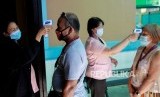 Petugas sekolah memeriksa suhu tubuh penjemput siswa sebuah sekolah cina di Quezon City, Metro Manila, Filipina mengenakan masker menyusul wabah virus corona yang menyebar luas dan cepat di China daratan, Selasa (28/1). (FOTO : ELOISA LOPEZ/REUTERS)