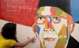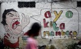 Seorang anak melintasi mural bergambar tokoh pendidikan Ki Hajar Dewantara di Jalan Z RW 08, Kelurahan Jatipulo, Kecamatan Palmerah, Jakarta Barat. (FOTO : Prayogi/Republika)