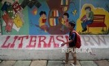 Seorang anak melintasi mural bertema literasi di Jalan Z RW 08, Kelurahan Jatipulo, Kecamatan Palmerah, Jakarta Barat. (FOTO : Prayogi/Republika)